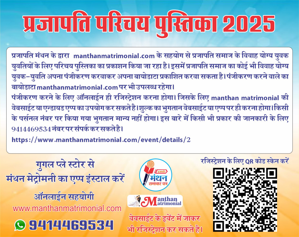 Prajapati Manthan in collaboration with manthanmatrimonial.com is publishing an introduction booklet for the marriageable boys and girls of Prajapati community. In this, any marriageable boy or girl of Prajapati community can get their biodata published by registering. The biodata of the registrant will also be available on manthanmatrimonial.com.